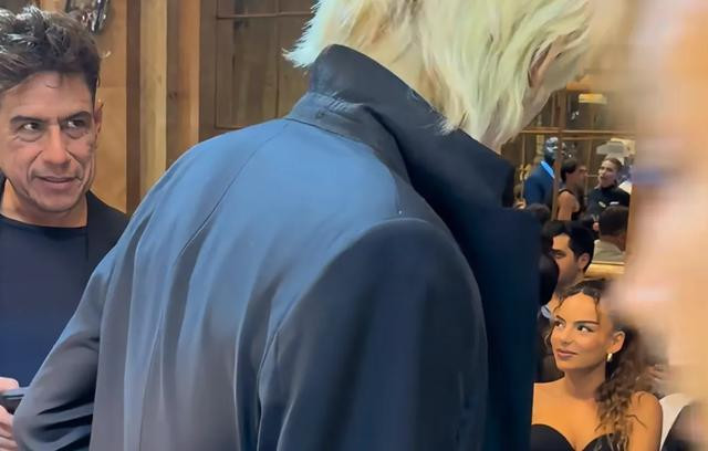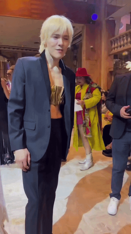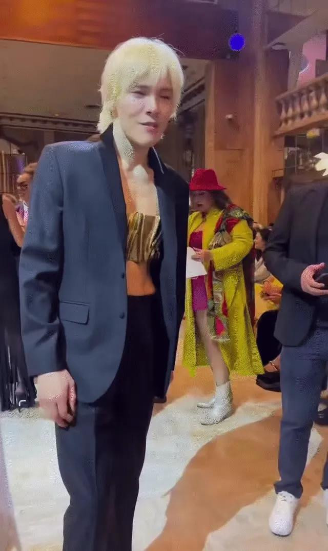 在一群个性鲜明,穿搭大胆的外国人中,他的穿搭也让人咂舌。他穿着黑色西服套装,里面只穿了一个金属抹胸。